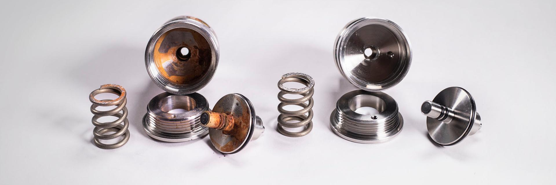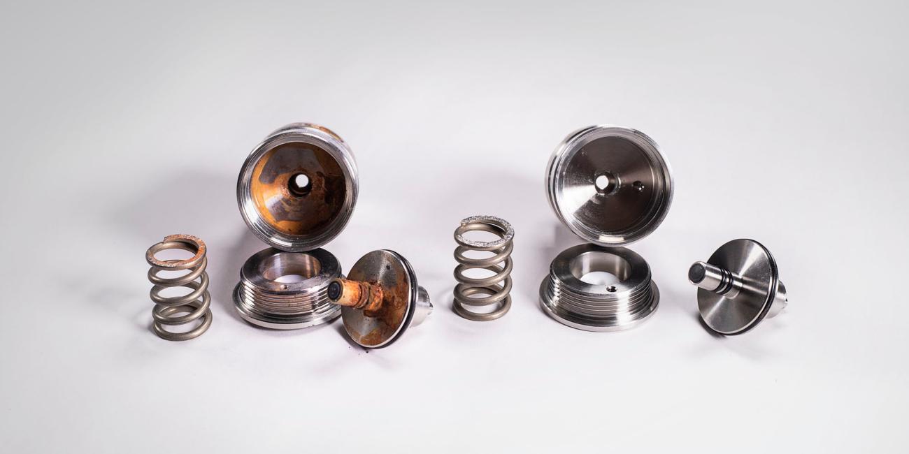 Links ein Chemikalienventil, das seit langer Zeit nicht mehr richtig gespült wurde.
